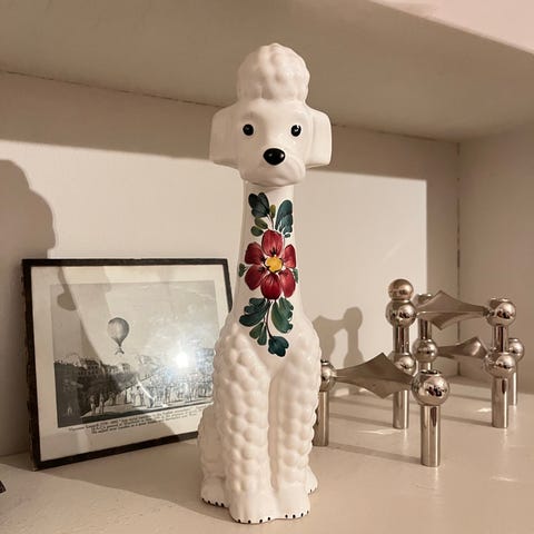 Keramiikkakoira koriste-esine ruskealla kiiltävällä pinnalla. Pieni ja koristeellinen esine,