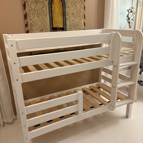 Kahdelle lapselle tai yhdelle lapselle sänky + leluvarasto / leikkimaja. Voidaan myös käyttää kahtena erillisenä sänkynä. Toinen vaahtomuovipatja painunut keskeltä, joten se kannattaa uusia tarvittaessa.