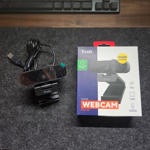 Trust Tanor webkamera, jonka tarkkuus on 1080p. Soveltuu videopuheluihin ja verkkokokouksiin.