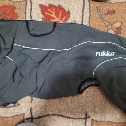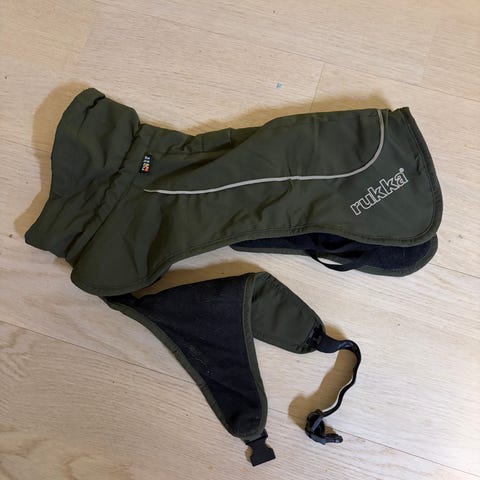 Rukan talvitakki, jossa on takajaloille kuminauhalenkit. Koko on XS40, mitoitettu pitkäselkäiselle koiralle. Kauluksen sisäreunalla kuminauha, jolla voi kiristää reunaa. Selkäpuolella on aukko, josta saa hihnan kiinnitettyä valjaisiin, jos haluaa koiralla käyttää valjaita takin alla. Takki on jäänyt liian lyhyeksi koirallemme, joten kuvissa takin takaosa nousee ylös selän päältä.