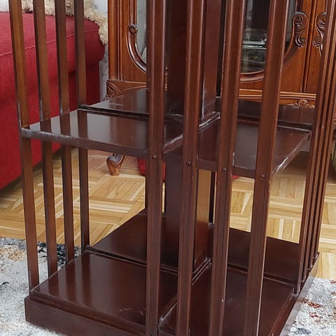 Myydään koivupuinen puusepän tekemä kirjakaruselli. Korkeus 71,5 cm, leveys kumpaankin suuntaan 35,5 cm. Karusellissa oleva kirja on kooltaan korkeus 21 cm ja syvyys 14,5 cm. Karusellin kunto muutoin hyvä, mutta pinnassa ilmeisesti kynää, jota en saanut pyyhittyä pois. Nouto Orivedeltä tai Tampereelta, jonne kulkeutuu omien menojen mukaan.