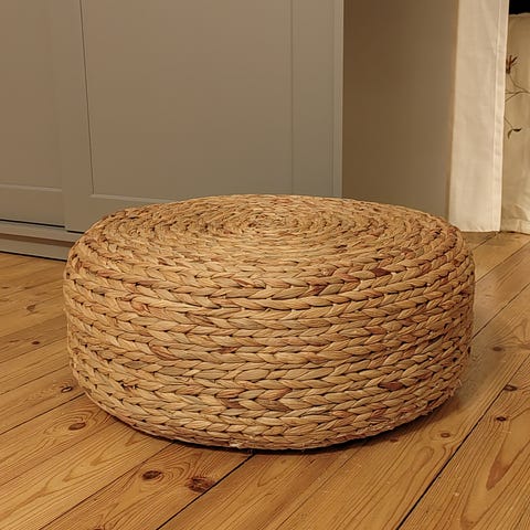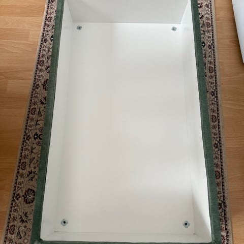Annetaan valkoinen keinonahkainen rahi. Yleisilme siisti, joitakin käytönjälkiä/kulumaa on.