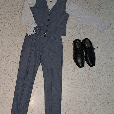 Juhlaan hieno puku eli housut, takki ja liivi. Vyötärössä joustovaraa.