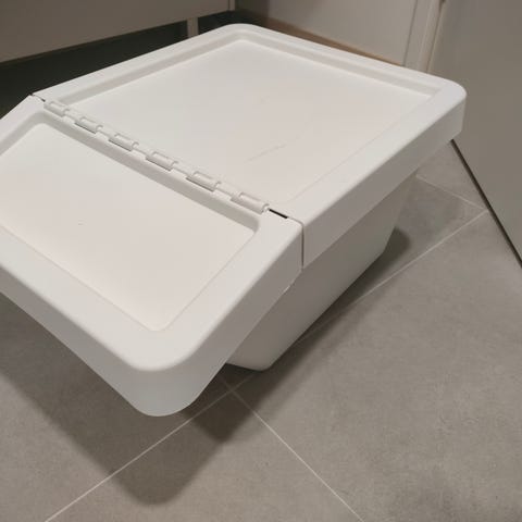 IKEA säilytyslaatikko. Laatikko on valmistettu kestävästä materiaalista ja soveltuu erilaiseen säilytykseen kodissa. Ulkopuolelta hieman pölyssä, sisältä siisti ja puhdas, ollut sisätiloissa. Toisessa pidempi sivu kaartaa sisäänpäin, täytettynä oikeaa.