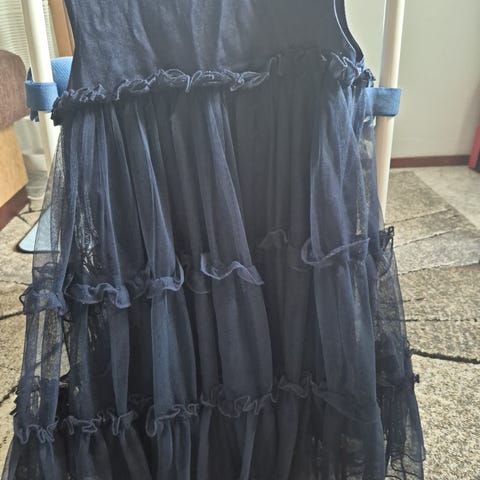 Musta juhlamekko hopeilla kirjailuilla.