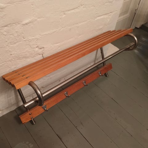 Siisti kunto. Yhdessä hattuhyllyn poikkipuussa pieni lohkema, ei näy kaytössä.