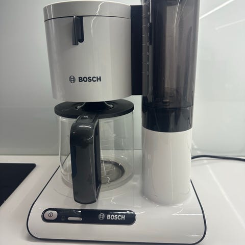 Bosch kahvinkeitin valkoinen väri. Laite on suunniteltu suodatinkahvin valmistukseen. Kahvinkeitin sisältää lasisen suodatinastian ja kannun.
