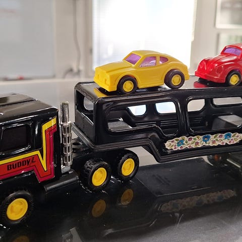 Tukkirekka-auto ja perävaunu -leikkisetti, joka sisältää kaksi osaa. Sopii leikkeihin ja kokoelmiin. Tarjoa