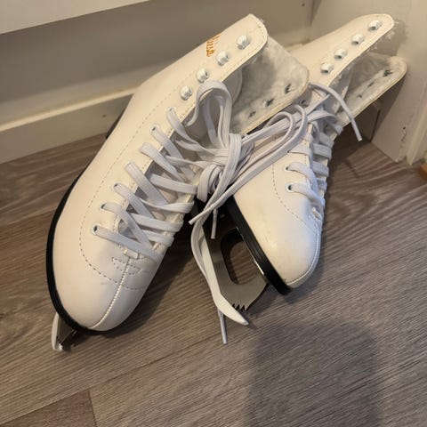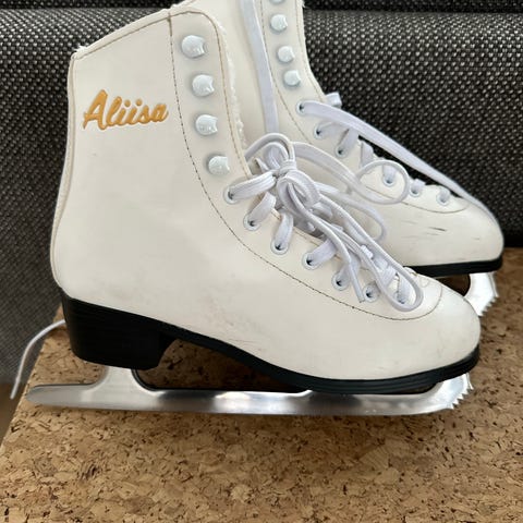 Aliisa luistimet, koko 36, valkoinen väri. Pinta vaurioitunut muutamissa kohdissa mutta toimii hyvin.