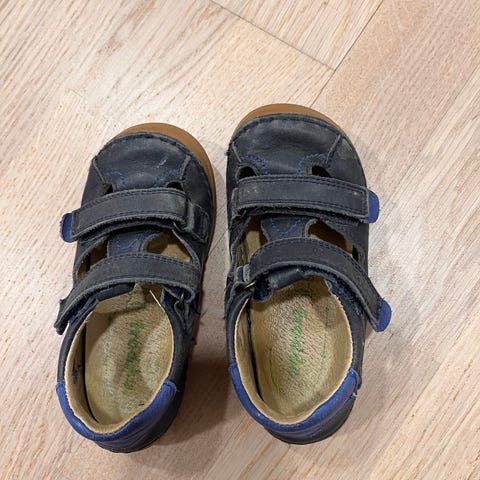 Myydään siistit nahkaiset Froddo paljasjalkasandaalit, koko 23. Tummansiniset, uutena ostetut, yhdellä käytetyt.