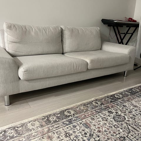 Myydään muuton tieltä vaaleanharmaa sohva. 3-istuttava sohva on alunperin ostettu Askosta, malli Stella. Irroitettavat päälliset. Sohva hyvässä kunnossa, ei näkyvää likaa tai tahroja. Sohvaan on tehty oston yhteydessä verhoilusuojaus (kts. viimeinen kuva). Ei lemmikkitalous.