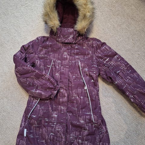 Reimatecin lasten toppatakki-/talvitakki koossa 134, väriltään tumma violetti. Muotoonommeltu malli ja pidempi, suunniteltu tytöille. Neppareilla irrotettava huppu irtokarvalla. Ehjä, hyvä, siisti kunto.