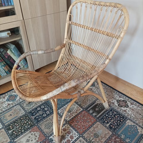 Iso korituoli, perussiisti. Istunpehmuste hieman menettänyt jo muotoaan ja nukkaantunut, alapuolella langannousua. Käsinoja edessä yksi pieni rimanpätkä katkennut, eipä hypi silmille.