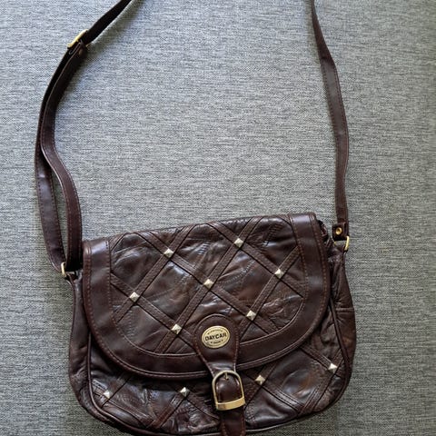 Keinonahkalaukku säädettävällä olkahihnalla. Koko 19x20x7cm