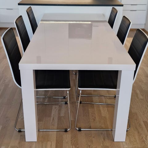 Perheen käytöstä valkoinen peruspöytä. Toimii hyvin isommallekin ryhmälle. Päätypaikoilla merkkejä pöydän pinnassa, muuten ok. Pöydässä puurunko, ja levyn voi halutessaan vaihtaa kätevästi uuteen. Kuvan tuoleja mahdollisuus lunastaa samaan kauppaan 10 euroa/kpl. Nyt mukavasti nopealla kaupalla.