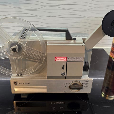 Vanha mutta toimiva projektori. Hieman on tuossa hopeisessa etuosassa naarmuja, näkyy kuvissa.