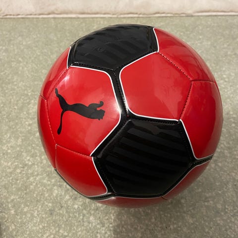Adidas jalkapallo, väriltään valkoinen ja punainen. Pallossa useita nimikirjoituksia.