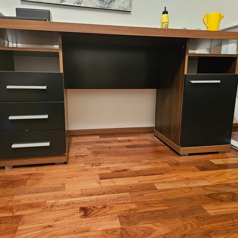 Työpöytä säädettävillä jaloilla. Pinnalla on pieniä kolhuja ja (todennäköisesti) pieniä kynsilakan roiskeita. Näkyy kuvassa. Vain haku.
