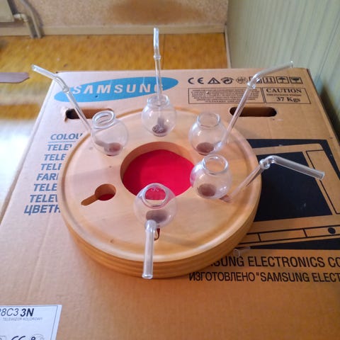 6 piippua tukevalla puualustalla.