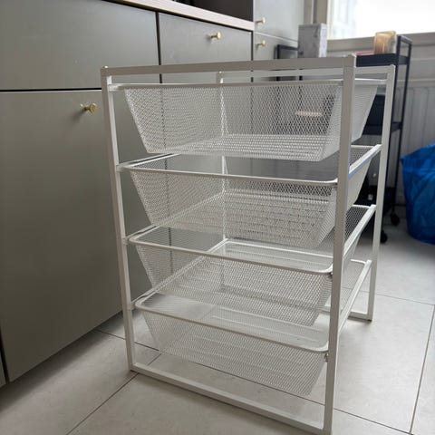 Myydään Ikean JONAXEL-säilytysjärjestelmä metallikoreilla. Tukeva ja ajattoman näköinen valkoinen metallirunko, jossa useampi ulosvedettävä verkkokori. Sopii erinomaisesti keittiöön, vaatehuoneeseen, kylpyhuoneeseen tai kodinhoitotilaan.