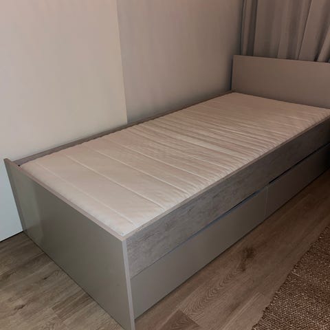 Alle vuoden käytössä ollut sänky säilytystilalla. Säilytystilaan uppoaa yllättävän paljon tavaraa. Säilytystilan pohjalla kangas, joka kiinni tarranauhoilla rungossa.