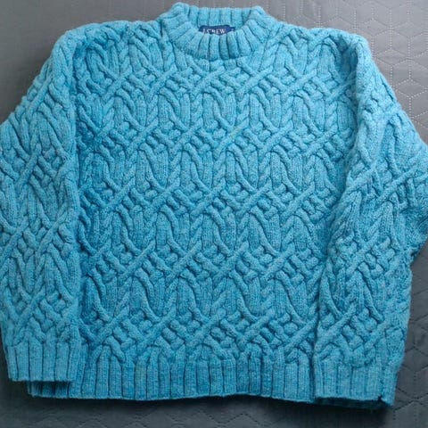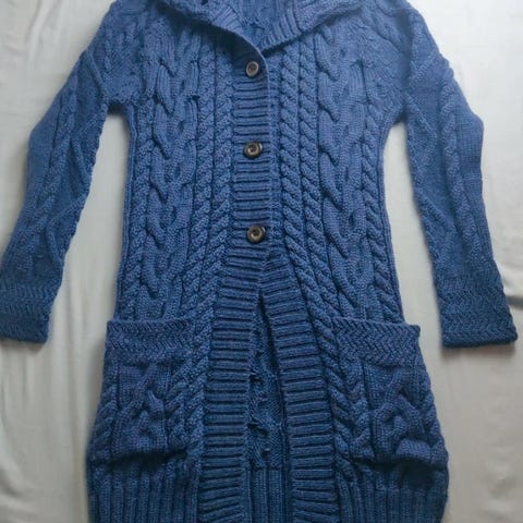 Myydään laadukas, tummansininen palmikkoneule villatakki tunnetulta irlantilaiselta suunnittelijalta.