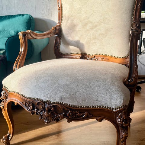 Sinapinkeltainen samettinen "Art Deco"tyylinen nojatuoli.