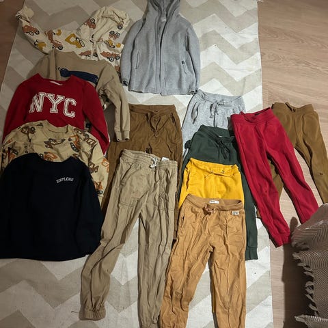 Tummansiniset housut ja harmaa lyhythihainen paita kunnoltaan hyvä. Muissa vaatteissa jonkin verran nyppyä, polvissa kulumaa ja kahdessa paidassa muutama pieni tahra. Vaatteet ovat kuitenkin ehjiä. Olen yrittänyt kuviin laittaa kaikki viat näkyviin.
