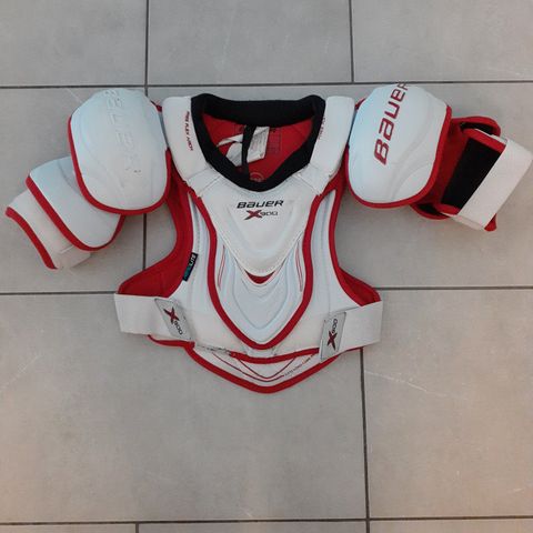 Hartiasuoja Bauer JR-Large. Hyväkuntoinen suojauksen osalta, mutta käytönjälkiä näkyy kankaassa.