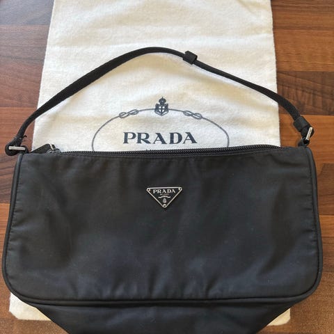 Miuccia Pradan vuonna 1998 suunnittelema Prada Tessuto Assimet -laukku. Musta nylonpinta ja hopeanväriset metalliosat. Tarranauhakiinnitys. Satiinivuorattu sisäpuoli ja vetoketjutasku sisällä. Prada-logolevy sivussa.