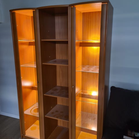 Annetaan kuvan mukainen kokonaisuus. Siistikuntoinen. Lasivitriinin ja hyllyn mitat ovat: korkeus 180, leveys 40 ja rungon syvyys 35. Tason ja laatikoston mitat ovat: korkeus 60, leveys 68 ja syvyys 35.