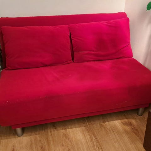 Runko ok, mutta päällisin puolin reippaasti kulunut sohva. Divaanin takaseinästä kangas repeillyt kokonaan.