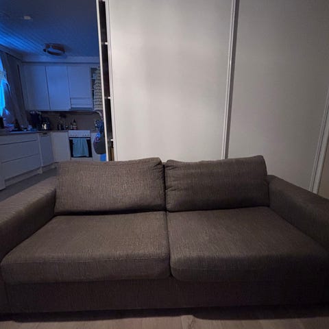 Vaalea sohva. Vaatii pesun tai kankaan vaihdon. Konepestävä kangas.