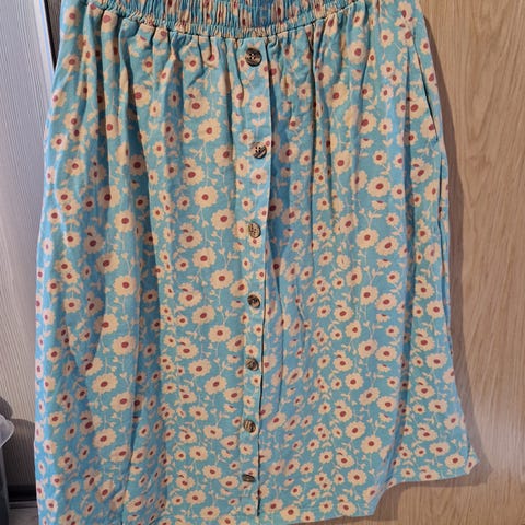 Mainio Clothingin kukallinen hame, koossa S/M. Erinomaisessa kunnossa, koska ollut käytössä vain muutaman kerran. Pesty kerran hajusteettomalla pyykinpesuaineella. Edessä koristenapit. Paksumpaa materiaalia, kuminauhavyötärö ja sivuissa taskut.