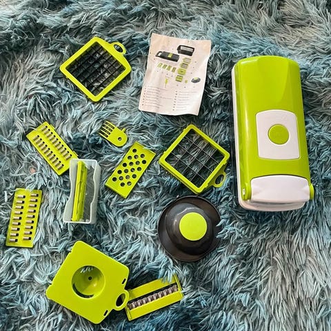 Vihamnesleikkuri, jolla voi pilkkoa hedelmät ja vihannekset suoraan kulhoon esimerkiksi salaattia varten. Mukana tulee sekä keskikokoinen että pienempi leikkuuterä. Kulhon tilavuus on 1,2 litraa. Leikkurin materiaali on muovia ja ruostumatonta terästä.