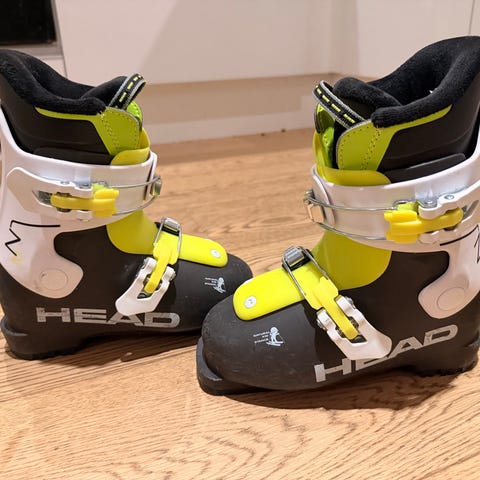 Head Lasten laskettelumonot, koko 195 sisäkenkä, kuvassa. Värit valkoinen, musta ja punainen. Monot on varustettu kahdella lukolla ja pehmeällä sisävuorella. Sopivat lasten lasketteluun.