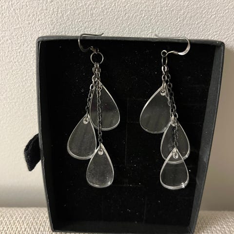 Kerran käytössä olleet mutta en osaa käyttää roikkuvia korviksia, joten tässä jollekkin tyylikkäät korut käyttöön. Muoto on todella kaunis pisara. Kevyet myös, eikä venytä korvaa.