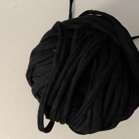 Mustaa trikookudetta 494g. Määrää riittää vaikka pieneen koriin. Virkatessa koukukkusuositus 8.0 tai 10.0, sen verran paksua. Hieman pölyinen, muutoin hyvässä kunnossa. Lankavalta aikoinaan ostettu.