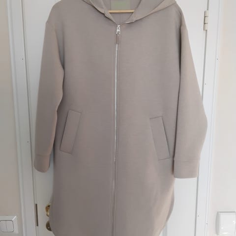AMISU Pitkä takki naisille, koko 36. Takki on beigen värinen ja valmistettu polyesteristä. Malliltaan pitkä takki.