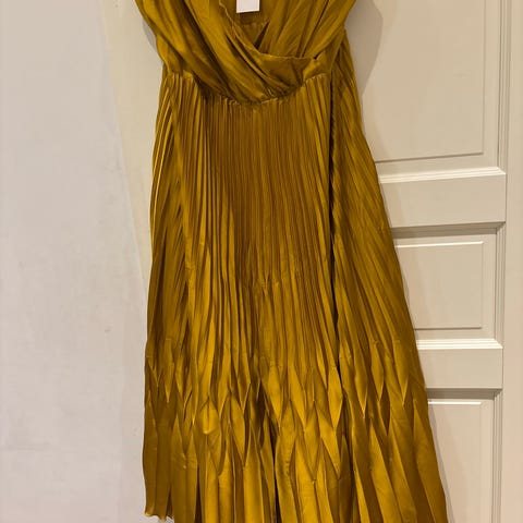 Takana on vetoketju. Olkaimet ompelija on lisännyt jälkeenpäin, ne saa helposti poistettua. Lantiolla kaunis koriste. Hintaan sisältyy myös kuvassa näkyvä hartiahuivi.