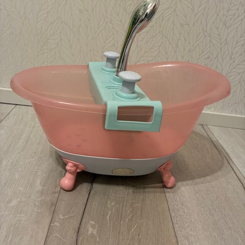 Kylpyleikkeihin nuken kylpyamme. Ammeeseen sopii Baby Bornin kokoinen nukke. Pientä käytön jälkeä pohjassa. Ehjä ja hyvä kunto leikkeihin.