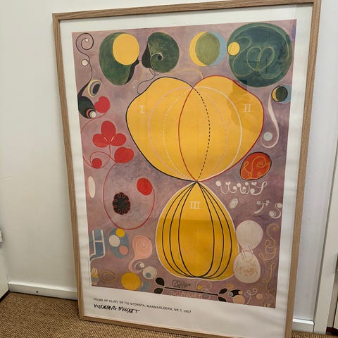 Albert Edelfeltin teoksesta vuodelta 1890, nimeltään 'Mansikoita tehty kehystetty juliste'. Kuvassa on kaksi henkilöä metsäisessä maisemassa, taustalla järvimaisema. Kehystetty kultaisilla kehyksillä.