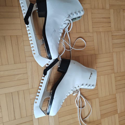Annetaan kuvissa näkyvät koon 38 luistimet. Ovat olleet vuosikausia ellei peräti kymmeniä käyttämättäminä kaapissa. Sisällä & lämpimässä. Ehjät mutta valkoinen pinta on vähän päässyt kellastumaan (ei pahasti mutta ei nämä ihan priimatkaan ole). Eiköhän näistä kuitenkin saa teroittamalla ihan kelpo luistimet kevyeen käyttöön!