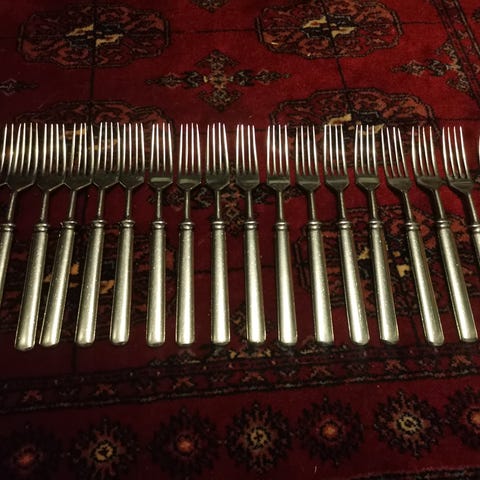 Hackman Sorsakoski sarjan haarukoita 9kpl ja lusikoita 9kpl setti. Ovat käytettyjä ja kuluneita mutta ehjiä. (osassa haarukoiden piikeistä pieniä taipumia)