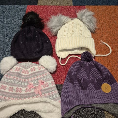 Myydään setti pipoja yhden käyttämiä koko 110/128, 51/53, 7e yht.