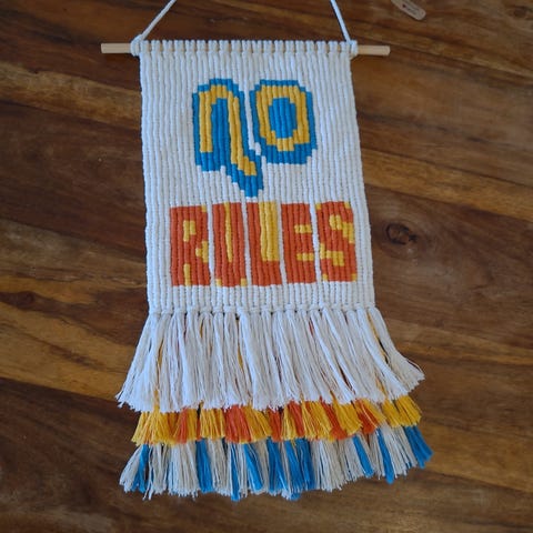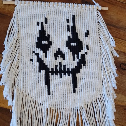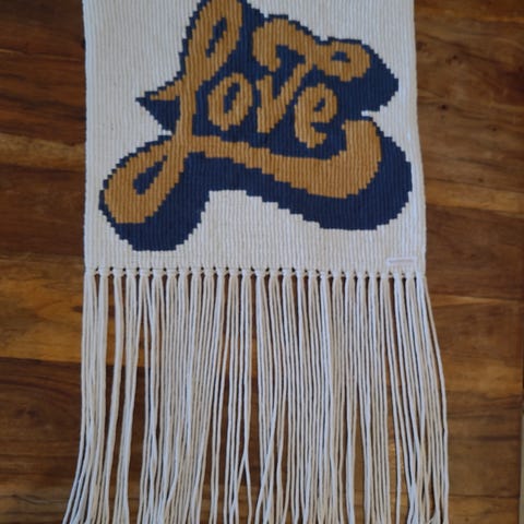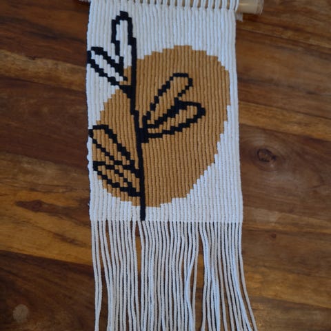 Luonnonvalkoinen hapsuilla ja tupsuilla.