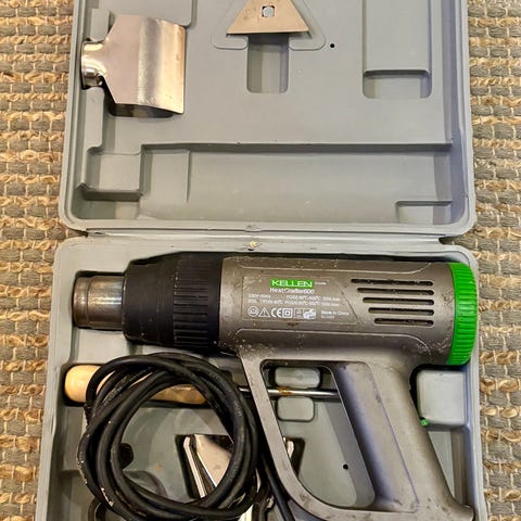 Nutool kuumailmapuhallin sähkötoimisena laitteena. Laite on musta ja sininen, mukana kantolaukku ja virtajohto.