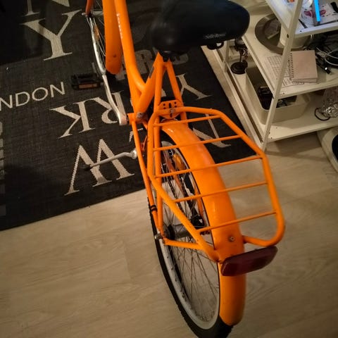 Renkaiden lokasuojat kiinni nippusiteillä (katso kuvat). En nyt muista olivatko kiinnitykset täysin rikki vai osittain. Penkki kulunut ja siinä reikiä (katso kuvat). Pyörän venttiilien korkkeja ei ole. Naarmuja ja maalien kulumia löytyy. Pyörän oman lukon avainta ei ole