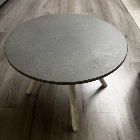 Myydään valkoinen matala sohvapöytä tai sivupöytä. Pöytälevy on hieman kolmionmallinen, "halkaisija" 55,5 cm ja korkeus 28,5 cm. Pöydän pinnassa on pienempiä käytön jälkiä sekä halkaisijaltaan n. 1,5 cm kupru maalissa.