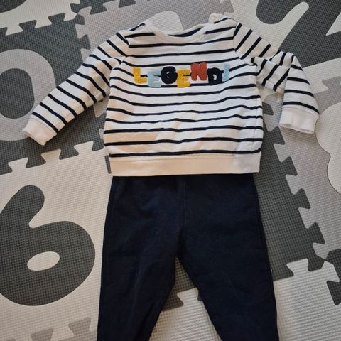 Siisti työkone aiheinen asu. Paita trikoota, housut ohutta collegekangasta. Kolo 74cm.